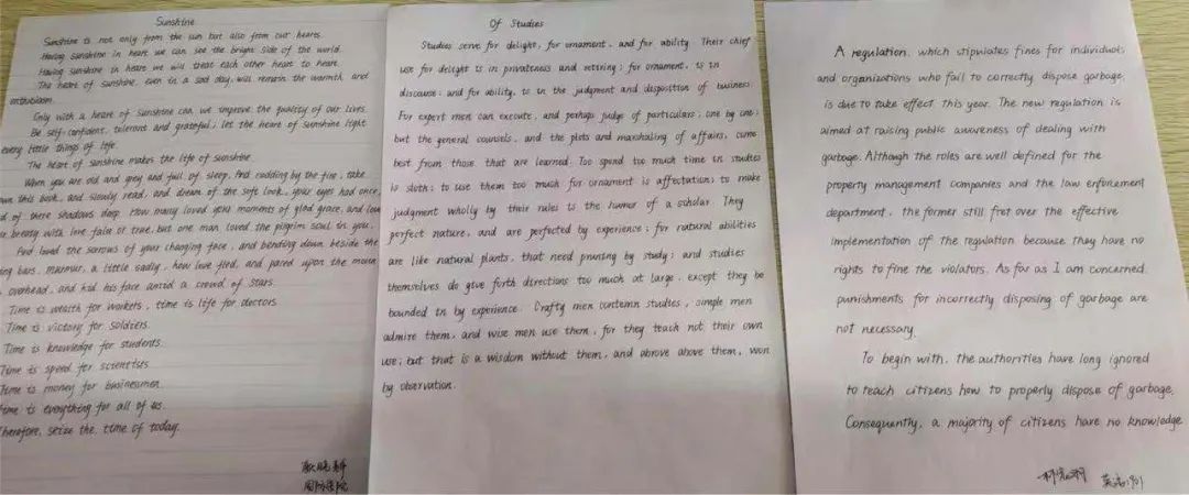 为营造浓厚的英语学习气氛,提高同学们的审美素质,培养同学们认识美、发现美、创造美的能力,鼓励同学们将有限的课余时间投入到更加积极有益的兴趣爱好中来,感受书写的魅力,国际学院于4月11日组织各个班级开展了“英语书法评比大赛”。