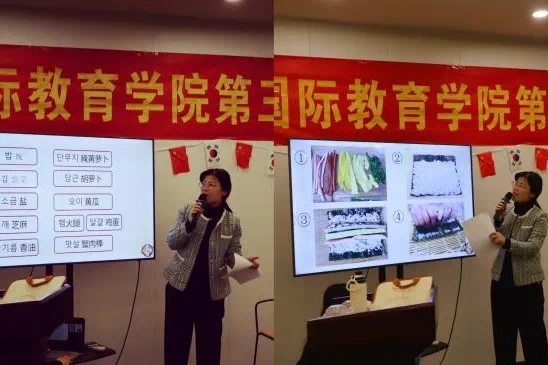 在正式体验之前,武丽云老师首先通过PPT的形式,向同学们讲述了紫菜包饭活动的相关韩语词汇和制作步骤以及注意事项,让同学们更多的了解了韩国饮食文化。极大的激发了学生们的参与热情。