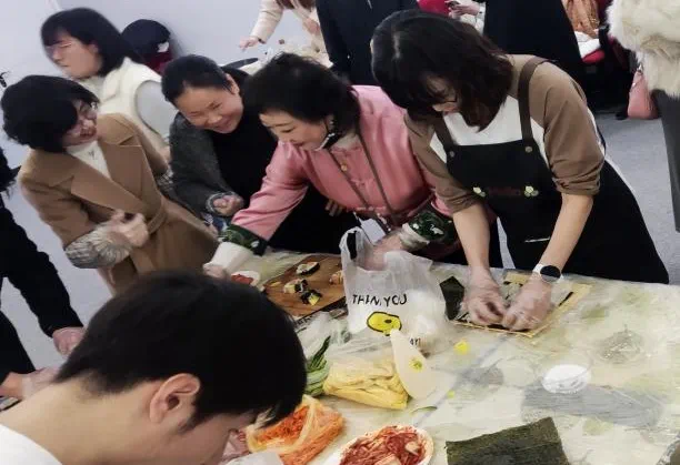紧接着,同学们在外教高杏淑老师的指导下亲自动手制作紫菜包饭,同学们纷纷投入在制作过程中并做出来色香味俱全的紫菜包饭,还试穿了韩服,真正体验了韩国文化。身着韩服的同学们又把紫菜包饭送到了学校老师们的办公室,让老师们一起品尝。