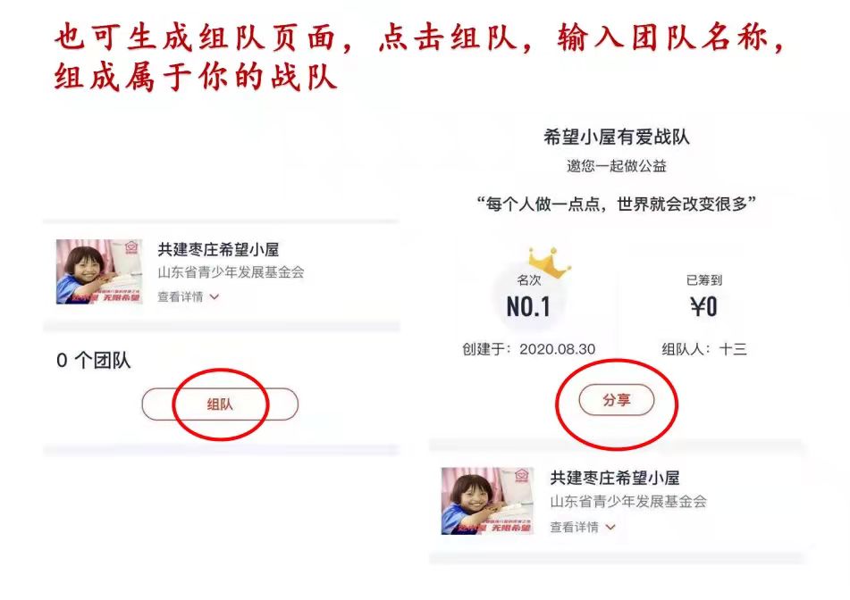 第六步:也可在自己“一起捐”页面里,点击“组队”,输入团队名称生成专属战队,例如:***公司销售一组团队、***学校三年二班团队等。