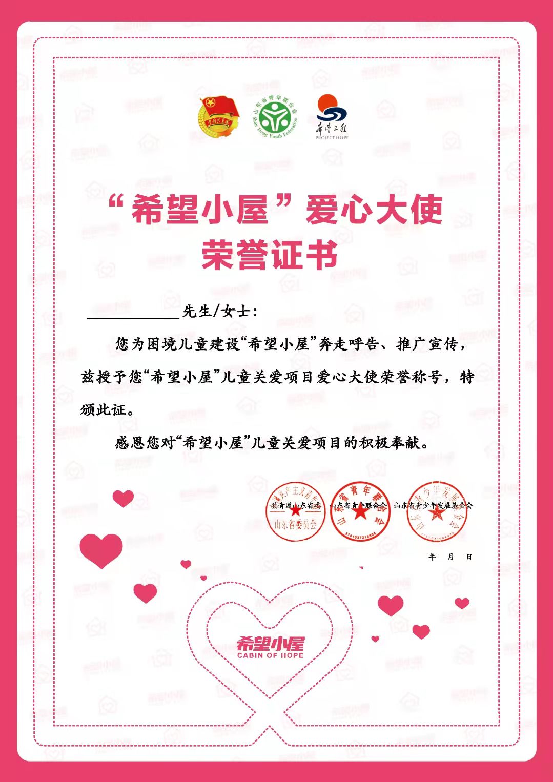 您如果帮助宣传推广希望小屋达到5间以上,我们将为您颁发“爱心大使”荣誉证书。