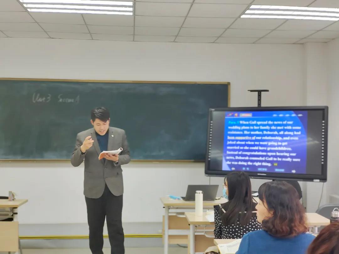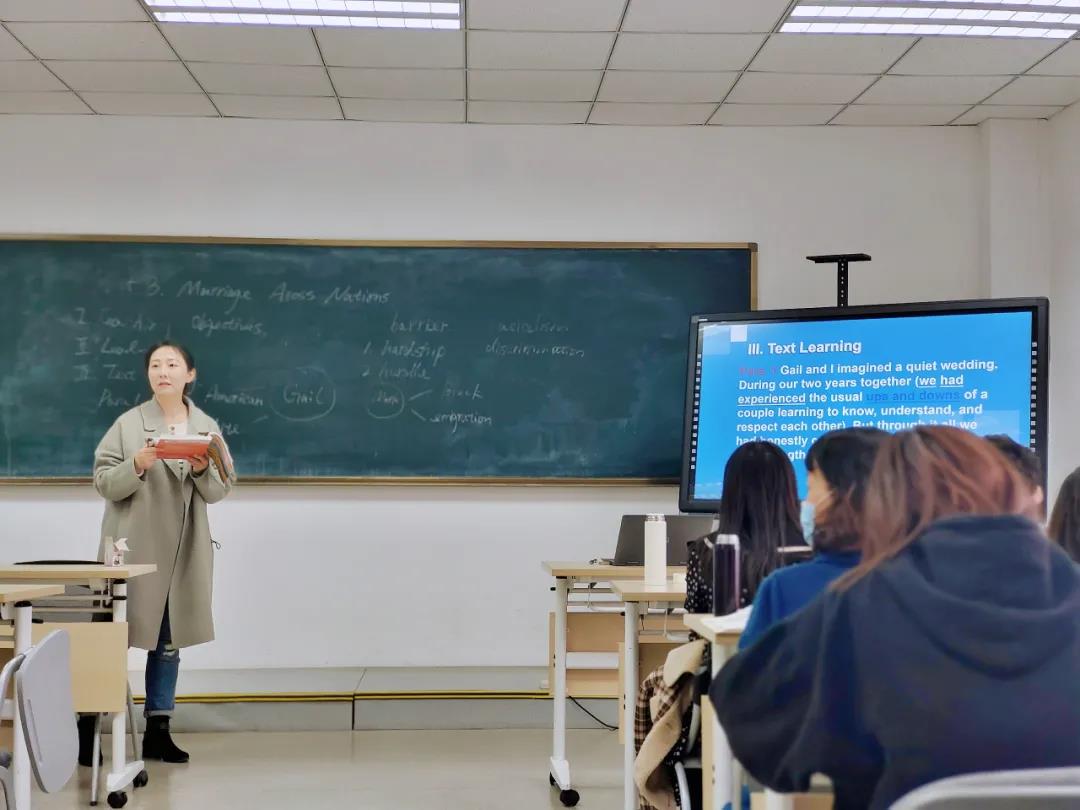 曹祺禛老师全英文授课,由点及面逐渐引入到《大学英语》的Unit 3 Section A课文的篇章分析,并讲授“had been supportive of”等重点语言内容,课堂各环节完整且丰富。