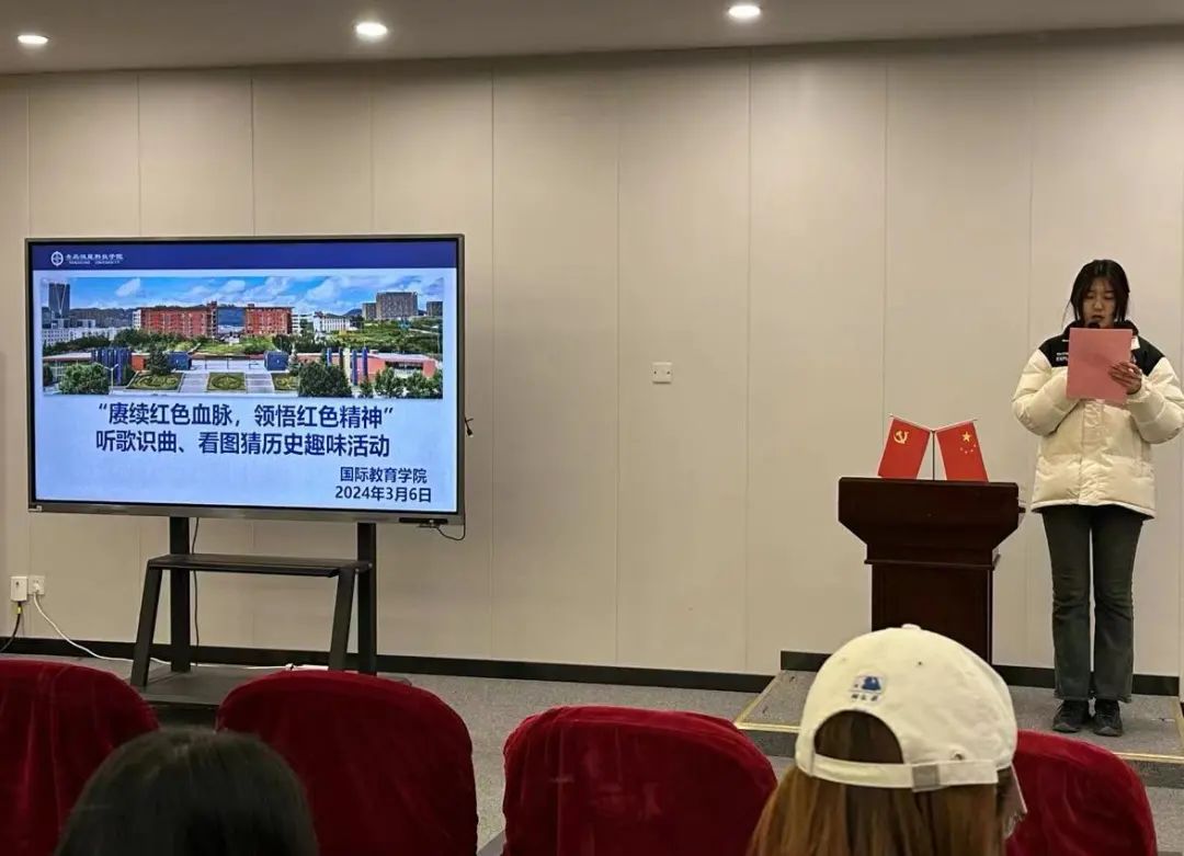 为深化对红色历史的了解,激发青年学生的爱国热情和革命精神,一场别开生面的“赓续红色血脉,领悟红色精神”听歌识曲、看图猜历史趣味活动在国际教育学院A1-二楼多媒体教室举办。本次活动由我院学生会组织部举行,吸引了众多学生积极参与。