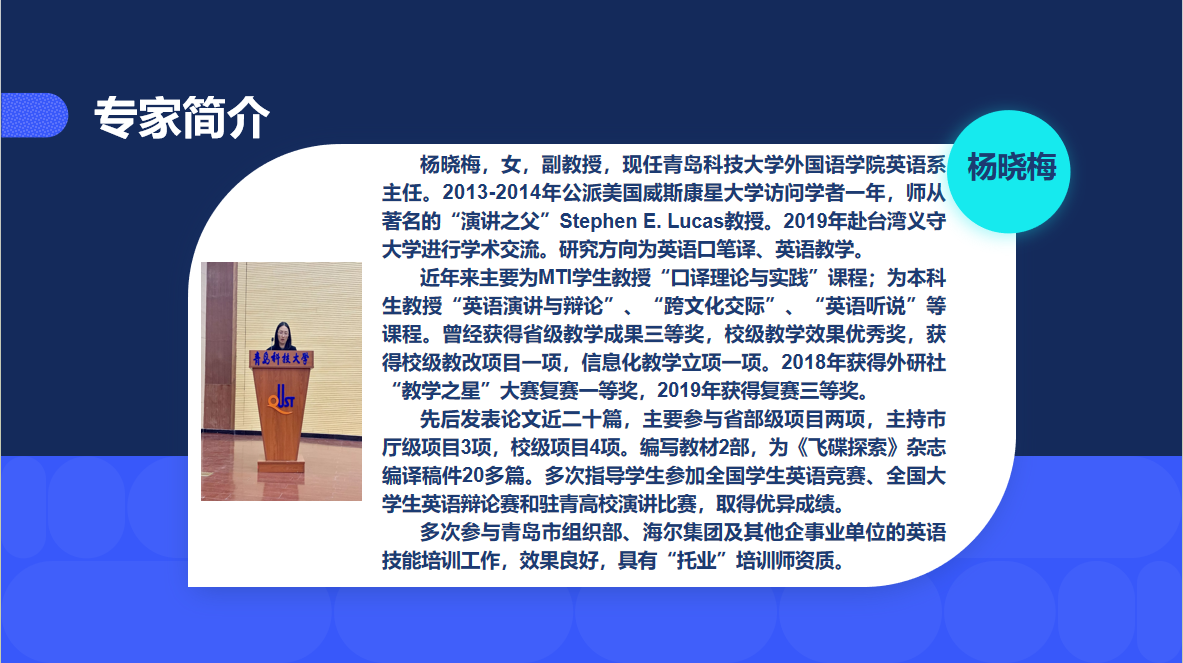 杨教授还介绍了传统演讲的两大分类:信息叙述型和说服行动型Informative和Persuasive. 二者要求演讲者要有较强的演讲心理素质,这里指的就是演讲者对演讲实践的反映和感受,是演讲者在进行演讲实践时所必然产生的心理活动和必然经历的心理体验过程。演讲者要具有求真的心理素质,不要去面对听众无病呻吟,也不要为了某种目的去些众取宠,否则你永远不会成为一个成功的演讲者。