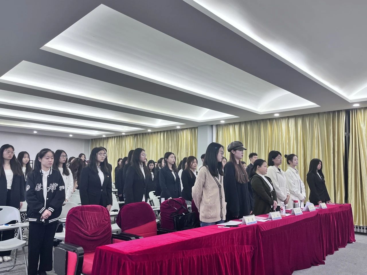 主持人介绍出席仪式的领导老师,他们分别是青岛恒星科技学院国际教育学院直属党支部书记、执行院长王玉华院长,国际教育学院辅导员罗赛老师、王楠老师、时伟佳老师、张迎杰老师,大家对各位领导老师的到来表示了热烈的欢迎。
