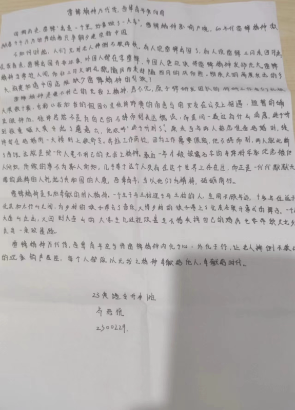 在我们的校园里,也有很多同学在践行着雷锋精神。他们可能是一名班干部,关心帮助每一位同学;他们可能是一名志愿者,积极参与各种公益活动;他们可能是一名文艺爱好者,用自己的才艺为大家带来快乐。他们在自己的校园生活中,用自己的方式践行着雷锋精神,为校园的和谐发展做出了贡献。