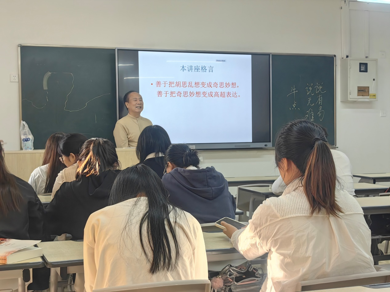 讲座最后,教授送给各位同学老师一句格言,“善于把胡思乱想变成奇思妙想,善于把奇思妙想变成高超表达”,这让在座的师生均受到了很大的启发。