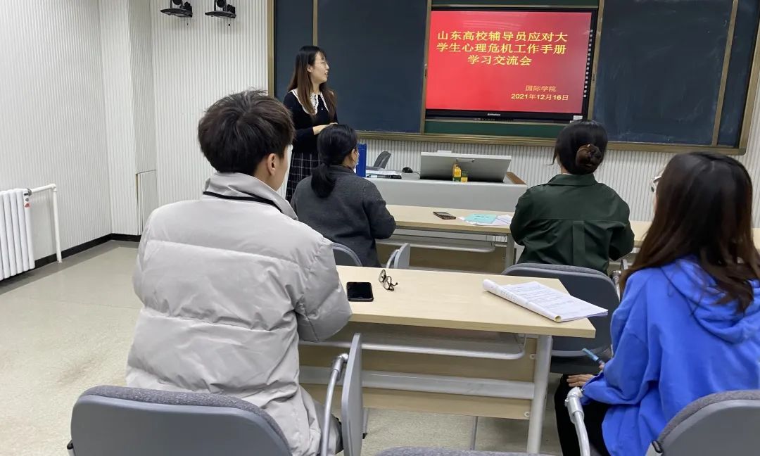 为更好地发挥辅导员在大学生心理危机预防和干预中的重要作用,国际学院于2021年12月16日在A1教学楼302教室召开应对大学生心理危机学习交流会,组织全体辅导员对《山东高校辅导员应对大学生心理危机工作手册》进行学习交流。