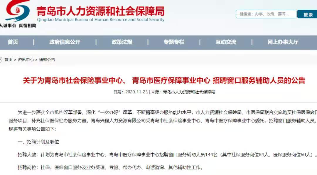 招聘人数:计划为青岛市社会保险事业中心、青岛市医疗保障事业中心招聘窗口服务辅助人员144名(其中社保服务岗位84人、医保服务岗位60人)。