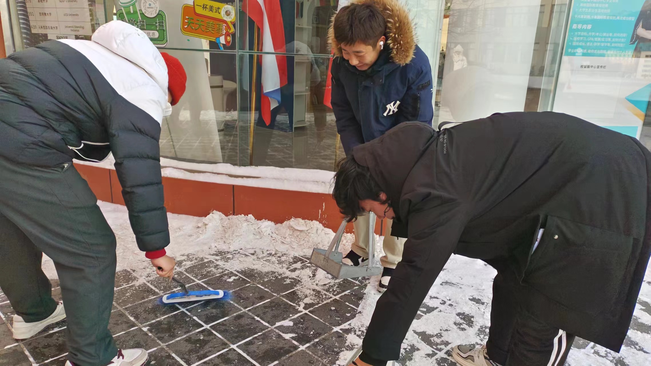志愿扫雪队的同学们两人一组,以先铲除积雪后专注除冰的方案团结协作,不畏严寒,相互配合;挥舞扫帚,一点点地将积雪和冰层扫起集中堆放;不仅如此,他们还分工合作,有的负责清理主干道,有的负责运送雪块到指定地点。尽管他们的脸上被寒风吹得通红,手被冻得僵硬,但他们仍然坚持着,因为他们知道,只有通过自己的努力,才能让校园的道路再次变得安全和通畅。