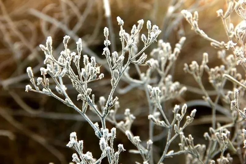 地面上的水汽遇冷凝结成白色冰晶,这就是所说的“霜”(frost)。这段时间里,植物慢慢失去生机,大地变得萧条,所以民间有“霜降冻百草”的说法。